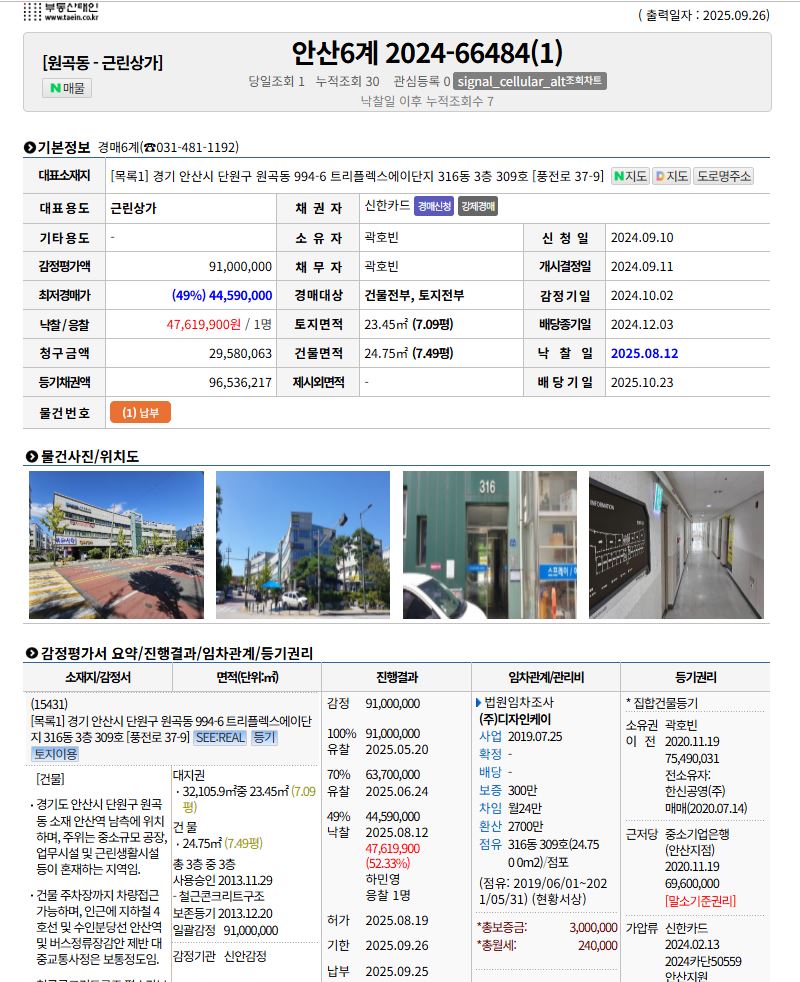 [수강생] 김*분님 안산 원곡동 상가낙찰 축하드려요~~ 페이지 정보 작성자 미소뱅크 댓글 0건 조회 100회 작성일 25-09-26 16:15 본문 김*분님 안산 원곡동 상가낙찰 축하드려요~~ 목록 이전글[수강생] 이*순님 안산 본오동 빌라낙찰 축하드려요~~ 25.09.26 다음글[수강생] 김*호님 안산 사동 아파트 낙찰 축하드려요~~ 25.09.17 댓글목록 댓글목록 등록된 댓글이 없습니다.